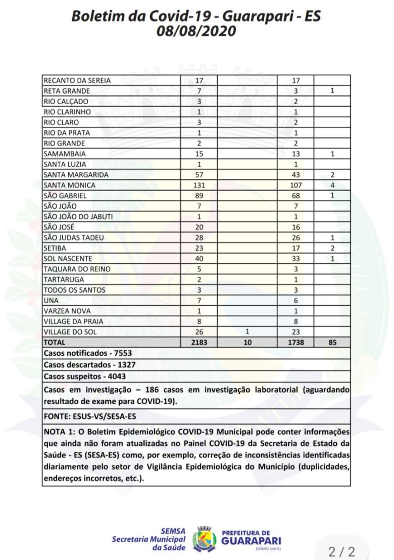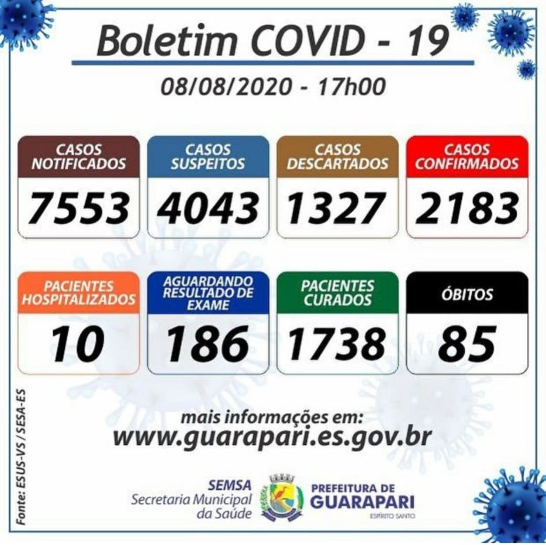 O boletim epidemiológico mais recente, divulgado hoje (08), pela Prefeitura de Guarapari, por meio da Secretaria Municipal da Saúde, atualiza o número de casos confirmados do novo coronavírus (Covid-19) no município para 2.183, 09 casos a mais que ontem (07). O documento também indica mais dois óbitos no município.