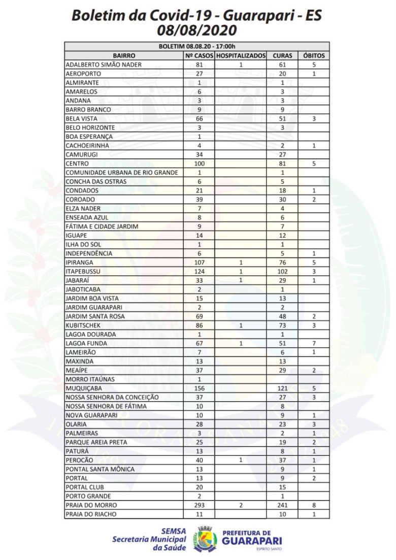 Hoje (08), Guarapari registrou mais dois óbitos pelo novo coronavírus. As vítimas fatais da doença residiam nos bairros Coroado e Santa Mônica. Com isso, a cidade totaliza 85 mortes.