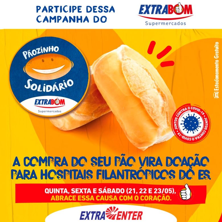 A rede de supermercados Extrabom iniciou hoje (21) a campanha do Pãozinho Solidário. Os valores arrecadados nas compras do pão francês de hoje até sábado (23) serão doados para hospitais filantrópicos do estado e o dinheiro será revertido para a aquisição de máscaras, álcool em gel e outros insumos essenciais para a proteção dos profissionais da saúde no combate ao novo Coronavírus (Covid-19).