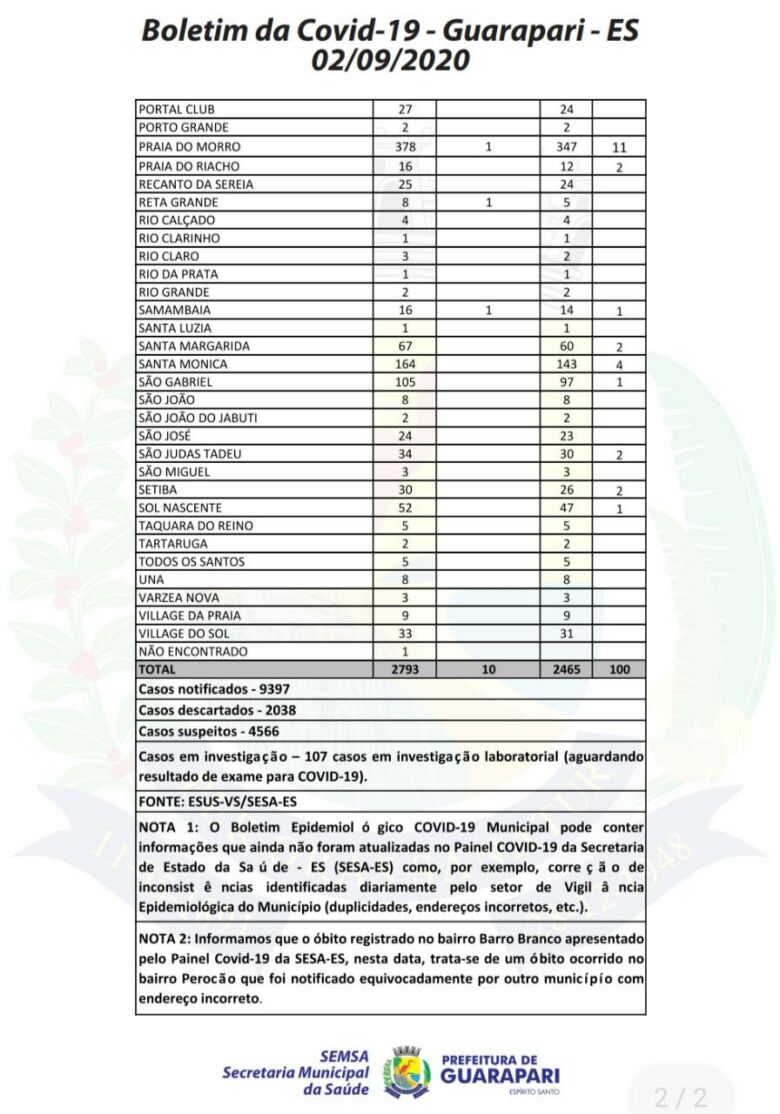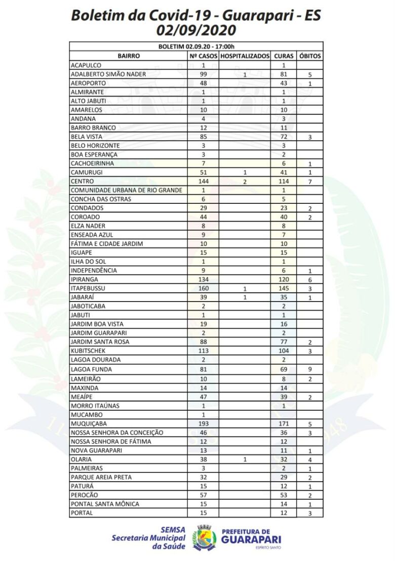 O boletim epidemiológico mais recente, divulgado ontem (02), pela Prefeitura de Guarapari, por meio da Secretaria Municipal da Saúde, atualiza o número de casos confirmados do novo coronavírus no município para 2.793, 47 casos a mais, em comparação ao dia anterior (01). O informe também anuncia mais um óbito, a centésima morte pela doença na cidade.