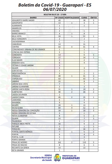 Confira o boletim detalhado atualizado, com a relação de casos da doença por bairros do município: