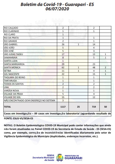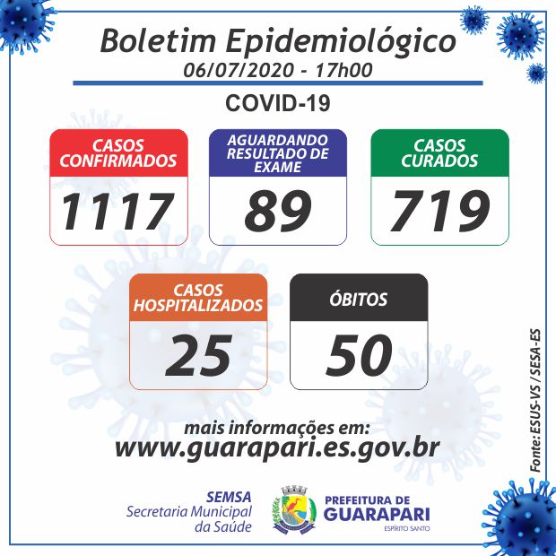 Conforme o boletim epidemiológico mais recente, divulgado hoje (06) pela Prefeitura de Guarapari, por meio da Secretaria Municipal da Saúde, o município registra 1117 casos do novo coronavírus (Covid-19), 28 casos a mais que ontem (05). Além disso, a cidade registrou mais três mortes pela doença.