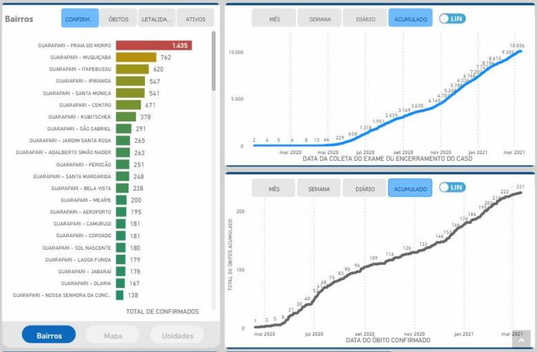 De acordo com as informações do Painel Covid-19, atualizado pela Secretaria Estadual de Saúde, o município de Guarapari ultrapassou ontem (11) a marca de dez mil casos confirmados da doença causada pelo coronavírus. Com a atualização que ocorreu ontem às 17h, o município passou a registrar 10.036 casos confirmados de Covid-19.