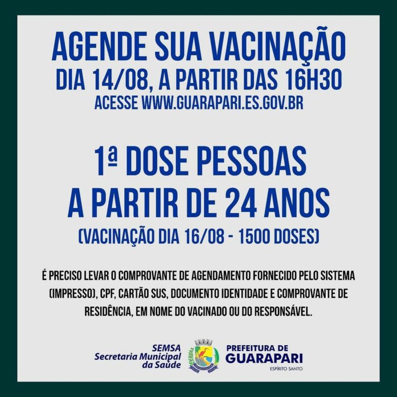 A Prefeitura de Guarapari, por meio da Secretaria Municipal de Saúde (Semsa), divulgou a convocação na manhã desta sexta-feira (13). De acordo com o comunicado, o agendamento deve ser realizado no site da Prefeitura de Guarapari, clicando no banner “Clique aqui para agendar a vacina”, que estará disponível no momento da vacinação.