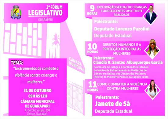 Com o tema “Instrumentos de combate à violência contra mulheres e crianças”, a Câmara de Guarapari realiza o 2º Fórum Legislativo, marcado para o dia 31 de outubro, das 9h às 12h. O evento acontece no plenário Ewerson de Abreu Sodré e será composto de três palestras sobre o assunto.