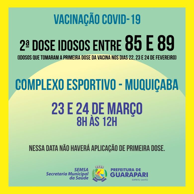 A Prefeitura de Guarapari, através da Secretaria de Saúde (Semsa), realiza na próxima terça-feira (23) e na quarta-feira (24), de 8h às 12h, no Complexo Esportivo Maurice Santos, a aplicação da segunda dose da vacina contra a covid-19, nos idosos de 85 a 89 anos, que tomaram a primeira dose da vacina nos dias 22, 23 e 24 de fevereiro.