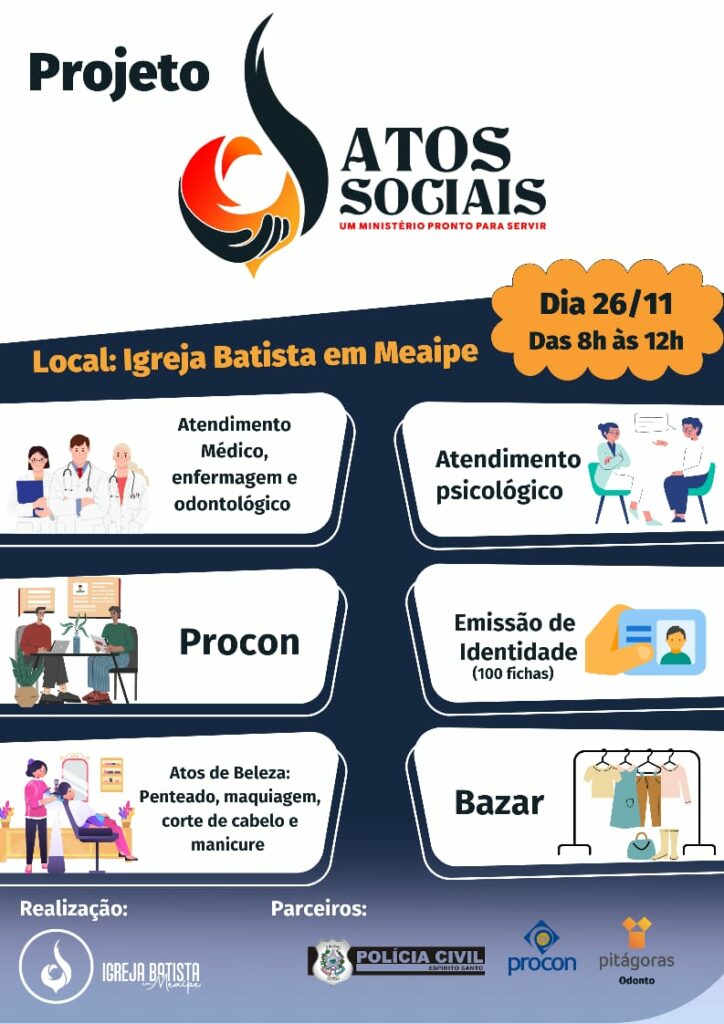 Com o objetivo de servir ao próximo, mostrando a importância que a igreja tem na prestação de serviços necessários e básicos para comunidade, o projeto Atos Sociais fará a 2ª edição nesse sábado (26) em Meaípe, Guarapari.