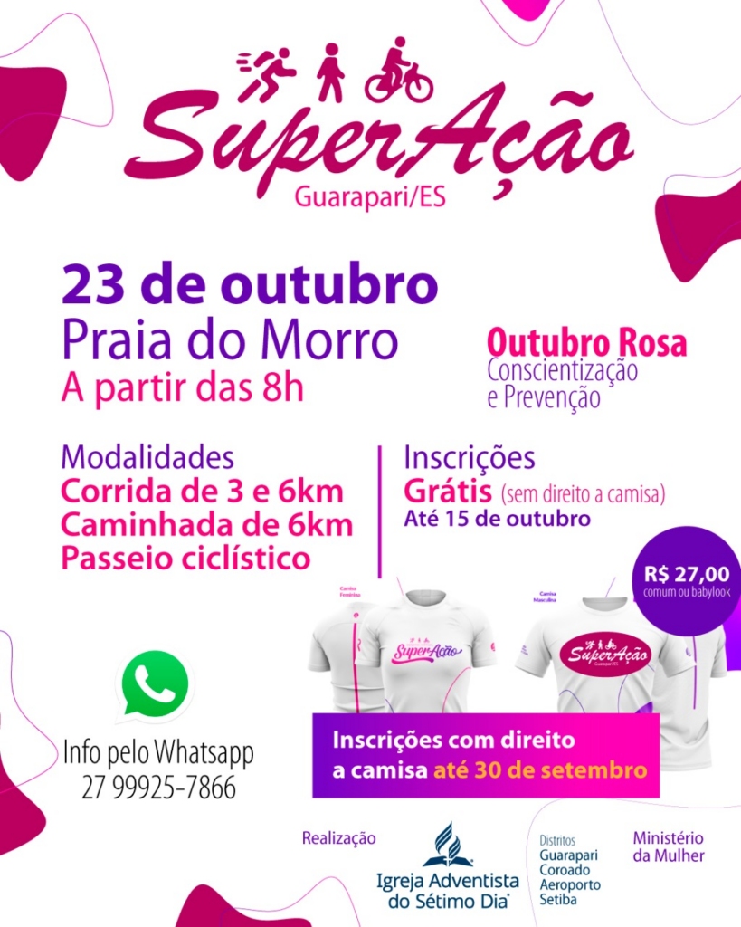 No dia 23 de outubro a Igreja Adventista do Sétimo Dia de Guarapari realizará uma corrida, em comemoração ao Outubro Rosa, com o objetivo de conscientizar a população sobre a prevenção e tratamento do câncer de mama. O evento, pensado por mulheres missionárias da igreja, vem sendo planejado desde janeiro deste ano e acontecerá na orla da Praia do Morro, a partir das 8h e com encerramento previsto para 11h.