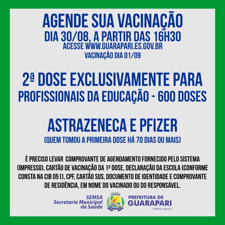 A Prefeitura de Guarapari, por meio da Secretaria Municipal de Saúde (Semsa), abre nesta segunda-feira (30), às 16h30, mais um agendamento para profissionais da educação que precisam tomar a segunda dose da AstraZeneca e Pfizer.