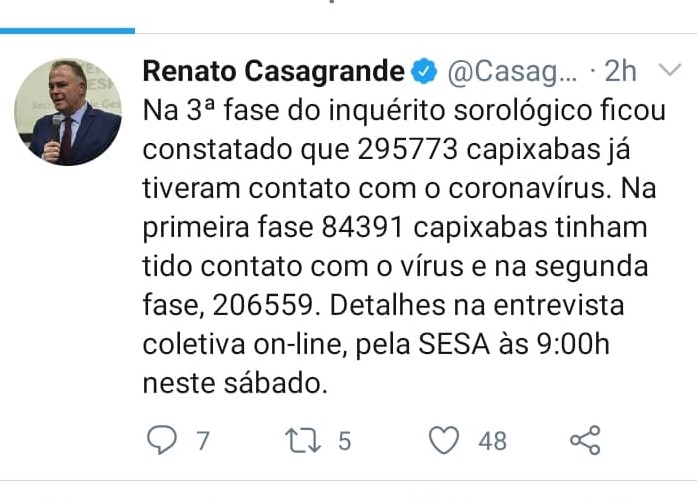 Na segunda etapa, foram realizadas 7.042 testagens entre população sorteada, pessoas que têm contato com o sorteado positivo e de pesquisadores. O estudo apontou uma prevalência de 5,14% da população infectada, o que representa uma estimativa populacional de 206.559 mil pessoas no Estado. Na primeira etapa, a prevalência foi de 2,1% da população infectada e uma estimativa 84.391 pessoas no Estado.