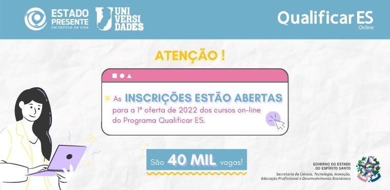 O Governo do Estado abriu hoje (15), as inscrições para os cursos online do Qualificar ES. São 40 mil vagas em 16 opções de cursos, com carga horária de 120 horas cada. O programa é gerenciado pela Secretaria de Inovação e Desenvolvimento (Sectides) e os interessados têm até o dia 25 de fevereiro para se inscrever através do site www.qualificar.es.gov.br.
