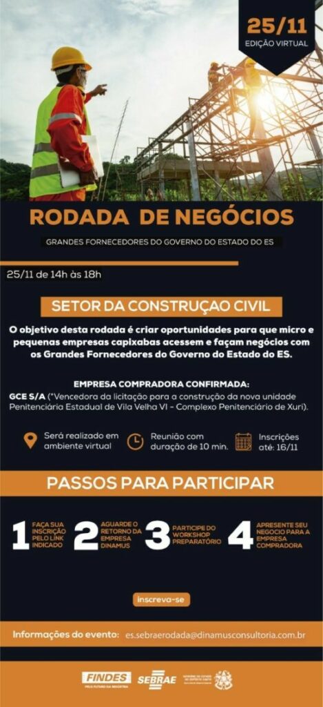 Voltada para a construção civil, a Rodada de Negócios contará com a participação da empresa GCE/SA, vencedora da licitação para a construção da nova unidade Penitenciária Estadual de Vila Velha VI – Complexo Penitenciário de Xuri. Na ocasião, as empresas capixabas terão a oportunidade de apresentar o portfólio de produtos e serviços, que atendam às demandas apresentadas pela GCE.