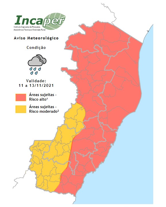 Já a Coordenação de Meteorologia do Incaper, divulgou um aviso meteorológico em nível de alerta de risco alto para a persistência das condições meteorológicas favoráveis para chuvas de intensidade moderada à forte, que podem resultar em acumulados significativos em algumas regiões do Estado.