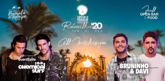 Para a noite da virada as vendas já estão abertas. O Réveillon acontece no sistema all inclusive e a programação conta com a dupla Bruninho & Davi e o projeto Chemical Surf.