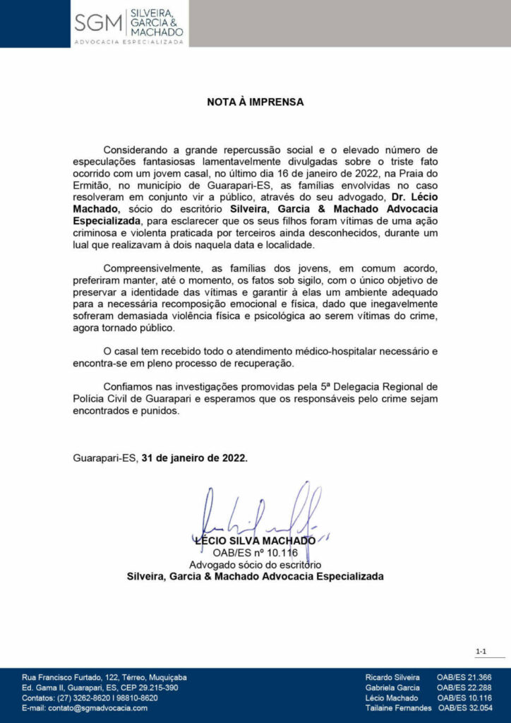 “A Polícia Civil informa que o fato é de conhecimento da Divisão de Homicídios e Proteção à Pessoa (DHPP) de Guarapari, que já iniciou diligências para elucidar o caso. Até o momento não há como afirmar que a namorada da vítima esteja envolvida. Nenhum suspeito foi detido e detalhes da investigação não serão divulgados, por enquanto.