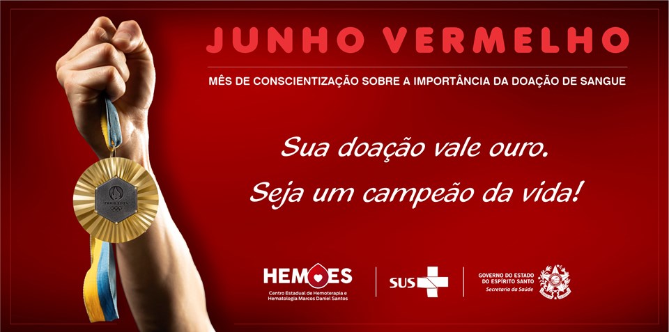 A Secretaria da Saúde (Sesa), por meio do Centro de Hemoterapia e Hematologia do Espírito Santo (Hemoes), vai comemorar o Junho Vermelho e o Dia Mundial do Doador de Sangue, data que acontece no próximo dia 14 de junho, com o slogan “Sua doação vale ouro” — inspirados pelos Jogos Olímpicos deste ano. As ações acontecem durante todo o mês de junho.