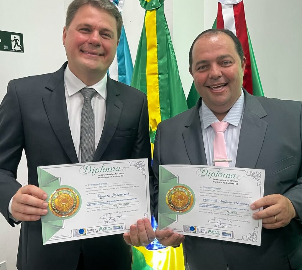 Na última quarta-feira (18), o prefeito eleito de Anchieta, Leonardo Abrantes (PSB), e o vice-prefeito, Renato Lorencini (União), foram oficialmente diplomados pela Justiça Eleitoral. A cerimônia, realizada no Espaço Cultural CÉU das Artes, atraiu um grande público, que lotou tanto o auditório quanto a área externa do local. Além dos escolhidos para o Executivo, vereadores eleitos e suplentes também participaram do evento.