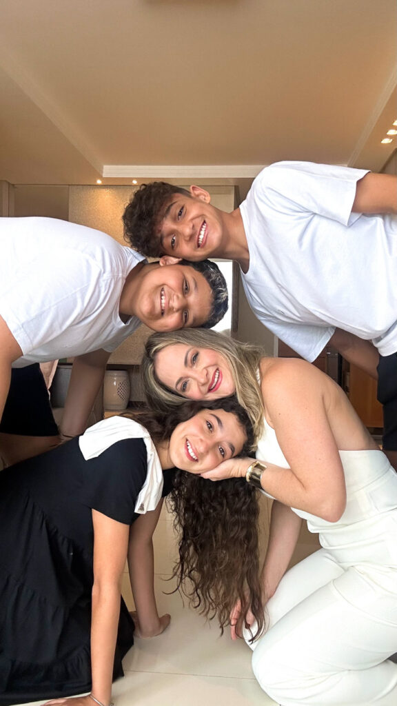 Complete a frase: Depois que me tornei mãe… tudo em mim se transformou. Meus horários, minhas prioridades, meu coração. Hoje, vivo com mais propósito e com muito mais amor. Faço questão de preparar os lanchinhos antes deles irem para a escola, de buscar quando dá, de almoçar junto. São nesses momentos simples que mora o afeto, o cuidado, a conexão que quero construir com cada um deles.