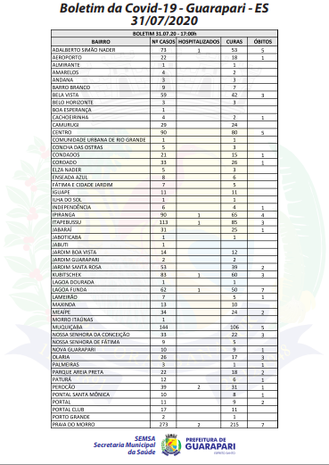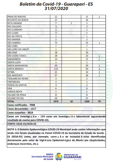 O novo boletim epidemiológico, divulgado hoje (31), pela Prefeitura de Guarapari, por meio da Secretaria Municipal da Saúde, atualiza o número de casos confirmados do novo coronavírus (Covid-19) no município para 1.972. São 44 casos a mais que ontem (30). O documento também indica mais 4 curados, além de 3.819 casos suspeitos.
