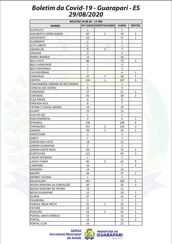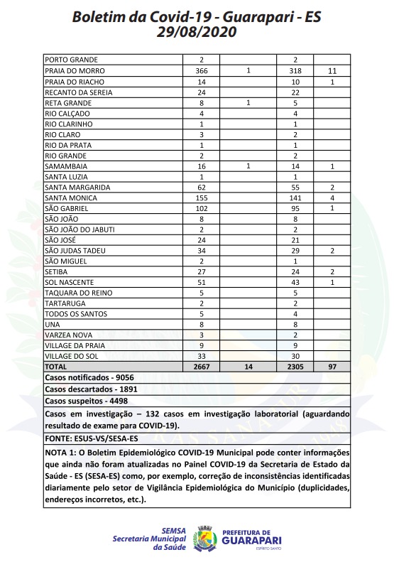 Neste sábado (29), a Prefeitura de Guarapari, através da Secretaria Municipal de Saúde, divulgou mais uma atualização do boletim epidemiológico com relação aos casos do novo Coronavírus na cidade. Os dados mostram que mais três pessoas morreram em decorrência da doença no município que totaliza, até o momento, 97 óbitos.