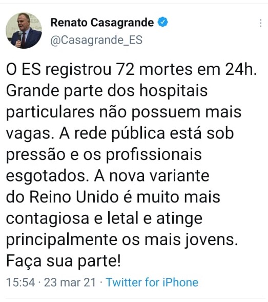O Estado está em quarentena desde 18 deste mês até o dia 31. Casagrande anunciou 14 dias com restrições de mobilidade em todo o Espírito Santo e interrupção das atividades não essenciais para desacelerar a transmissão do coronavírus.