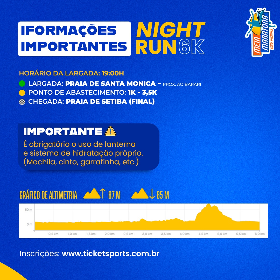 Serão premiados com troféus os cinco primeiros colocados na categoria Geral – Masculino e Feminino – nas distâncias de 6 km Night Run, 5 km, 10 km e 21 km e desafio 6 km + 21 km.
