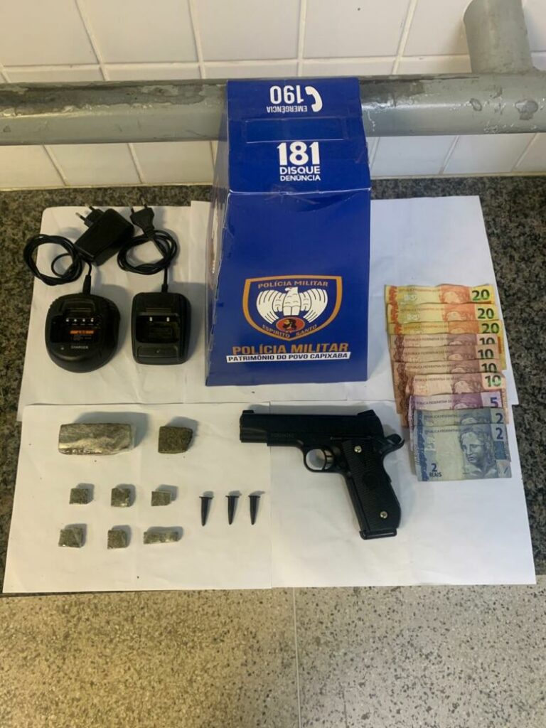 Foram apreendidos um simulacro de pistola, seis buchas de maconha, um pedaço médio e um menor de maconha, três pinos de cocaína, R$ 109 reais e duas bases de rádio comunicador.