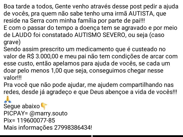 Vitória Loyola Souto iniciou uma campanha nas redes socias com a intenção de conseguir ajudar o pai, Flaviano Souto Neto, a comprar um medicamento de valor alto para a irmã, Flaviany Brito Souto, 11 anos, diagnosticada com autismo severo. “Desde o primeiro diagnóstico, houve piora no quadro. Aumentaram as crises e tudo se complicou. Ela não interage, não fala, e as crises são manifestadas por meio de choros e gritos”, explicou Vitória.