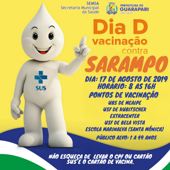 Uma campanha de vacinação contra o sarampo será realizada em Guarapari no próximo sábado (17). As vacinas são destinadas a pessoas com idade entre 01 e 49 anos, que no momento da aplicação devem portar o cartão de vacina e o CPF ou o cartão do Sus. Os pontos de vacinação estão localizados em Meaípe, Kubitschek, Bela Vista, Santa Mônica e Muquiçaba e funcionarão de 08h as 16h.