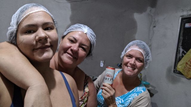 Adriana entre a amiga e a filha na produção das marmitas do último domingo.