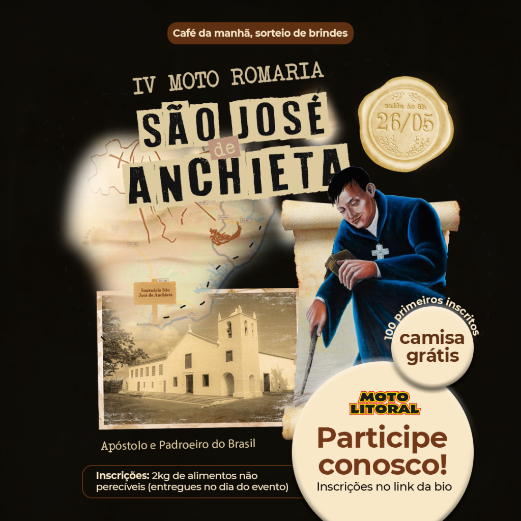 No próximo domingo (26), às 8h, motociclistas se unirão para a 4ª Moto Romaria São José de Anchieta promovida pela Moto Litoral Guarapari. O ponto de encontro é na loja de Muquiçaba, com previsão de saída às 9h para seguirem em direção ao Santuário Nacional, em Anchieta, onde haverá um café na manhã e sorteio de brindes recepcionando os romeiros.
