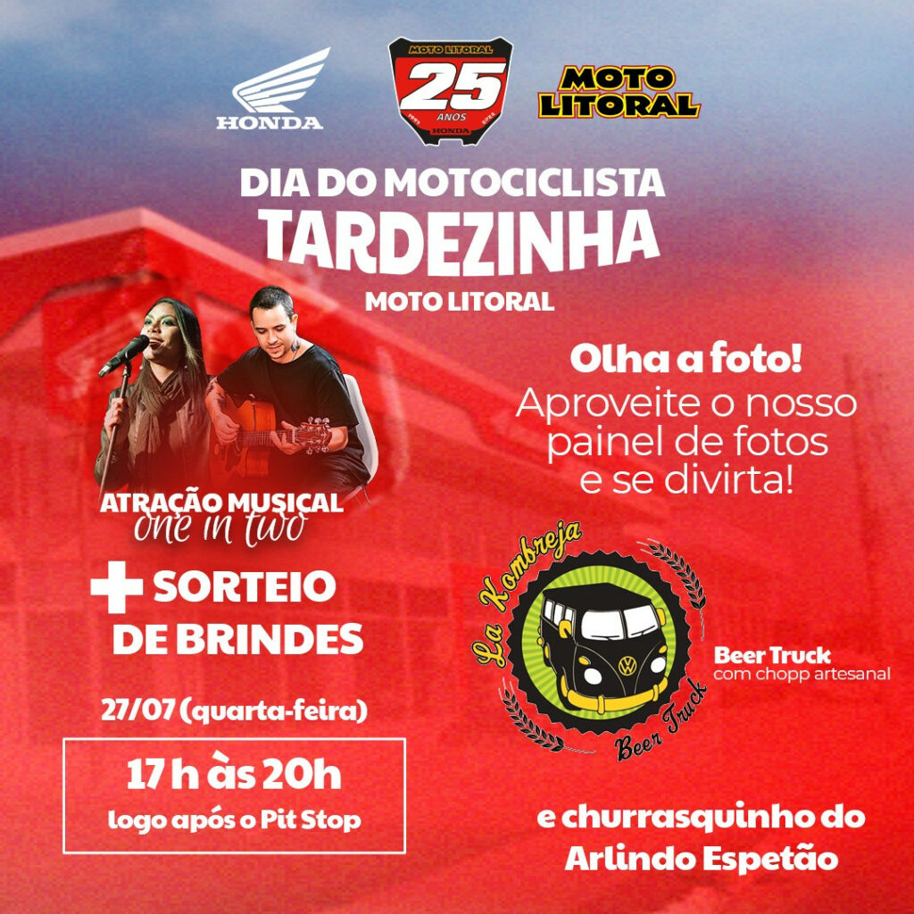 A partir das 17h, a empresa preparou uma tarde diferente para os clientes: a Tardezinha da Moto Litoral. Será a primeira edição do evento, que contará com música ao vivo, com sucessos do pop/rock cantados pela dupla One In Two, sorteio de brindes e painel para fotos. Os food trucks La Kombreja e Churrasquinho do Arlindo estarão presentes vendendo chope e churrasco.