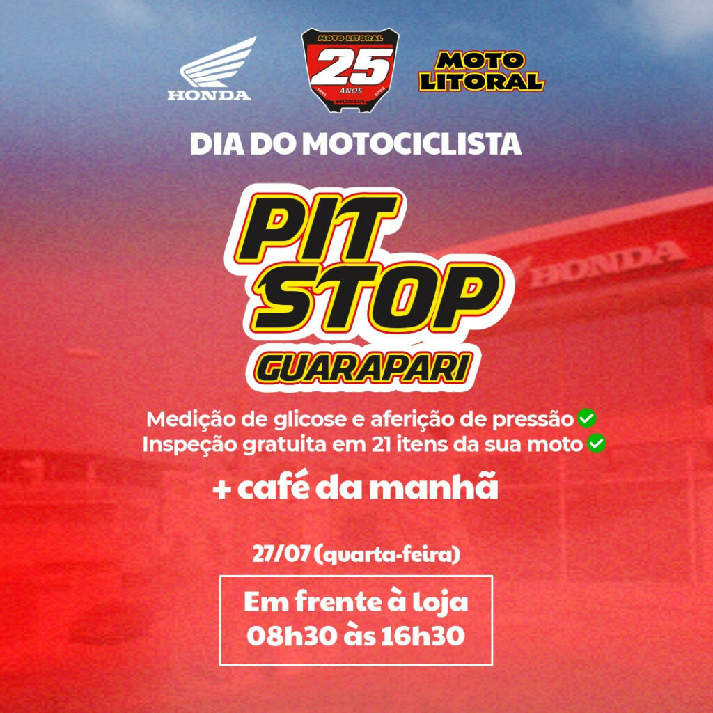 As comemorações dos 25 anos da Moto Litoral seguem movimentando Guarapari, e nesta quarta-feira (27), Dia do Motociclista, a empresa irá realizar o segundo Pit Stop e a primeira edição da Tardezinha da Moto Litoral. Os eventos acontecerão em frente a loja de Guarapari.