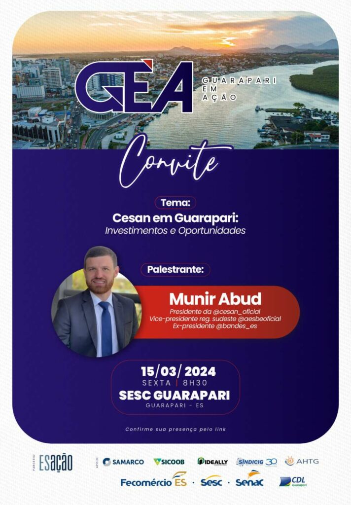 O auditório do Sesc Guarapari recebe nesta sexta-feira (15), às 08h30, o presidente da Companhia Espírito Santense de Saneamento (Cesan), Munir Abud, para uma palestra sobre o sistema de abastecimento de água do município. O encontro também dará espaço para um debate com os empresários da região.