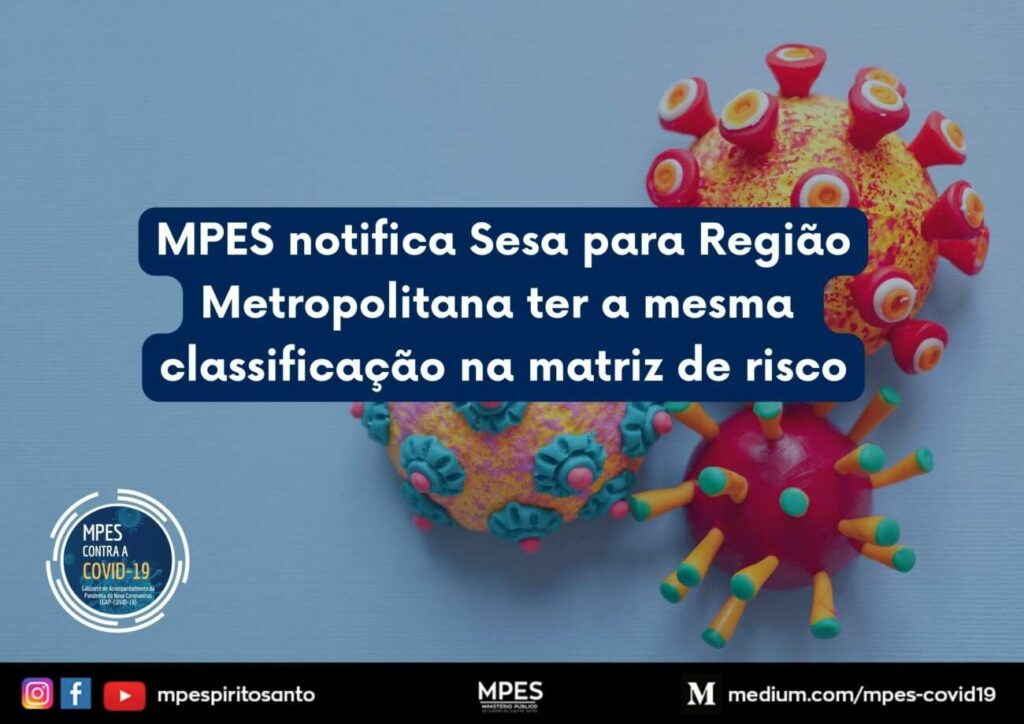 O Ministério Público do Estado do Espírito Santo (MPES), por meio da Promotoria de Justiça Cível de Vitória, notificou o Secretário de Estado da Saúde, Nésio Fernandes, para adotar as medidas administrativas necessárias para que os municípios que compõem a Região Metropolitana da Grande Vitória (RMGV) tenham a mesma classificação na matriz de risco, considerando como referência o município que obtiver a avaliação mais grave. A medida vale para Vitória, Vila Velha, Serra, Cariacica, Fundão, Guarapari e Viana e decorre da classificação dos municípios de Serra e Vila Velha em Risco Moderado, diante do aumento expressivo de casos de Covid-19 no Estado e da epidemia do vírus Influenza provocada pela nova variante H3N2.