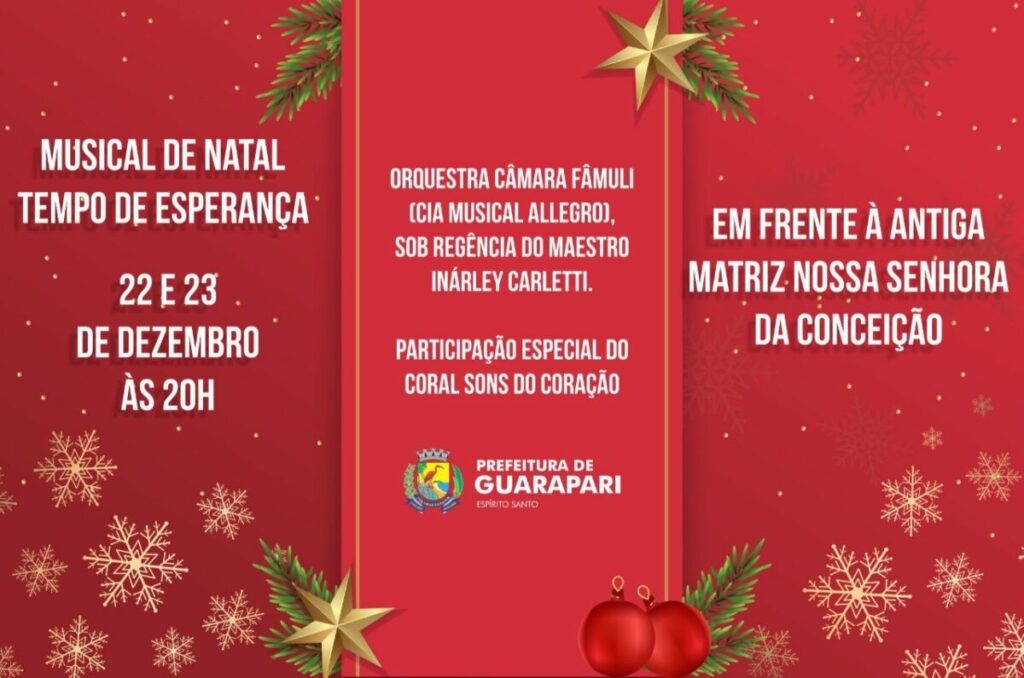Realizada pela Secretaria Municipal de Turismo Empreendedorismo e Cultura (Setec), o Musical de Natal “Tempo de Esperança”, apresentado pela Orquestra Câmara Fâmuli, da Companhia Musical Allegro, sob regência do maestro Inárley Carletti, acontecerá nos dias 22 e 23 de dezembro, às 20h, e terá a participação especial nos dois dias de evento do Coral Sons do Coração da Secretaria de Educação Municipal (Semed).
