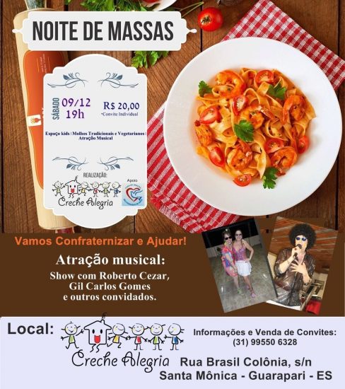 No próximo sábado (09), a solidariedade entra junto à diversão na Noite de Massas promovida pela Creche Alegria. O evento conta com Espaço Kids e atrações musicais, no estilo brega, como Roberto Cézar, Gil Carlos Gomes e outros convidados.