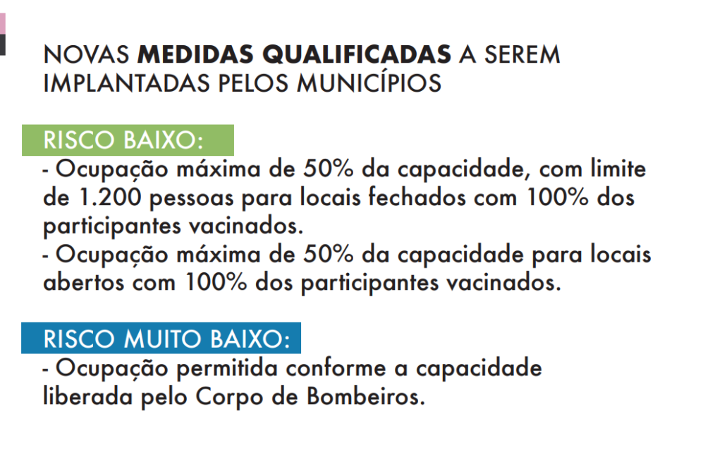 Entre as definições para o Risco Muito Baixo, está a exigência da vacinação com duas doses ou dose única para diversas atividades como, por exemplo, a visitação às Instituições de Longa Permanência para Idosos (ILPIs), presídios etc. As novas definições serão publicadas no Diário Oficial do Estado.