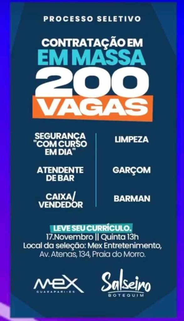 O Grupo Mex Entretenimento abriu um processo seletivo para contratação de 200 profissionais em Guarapari. Além da boate e casa de shows já conhecida por moradores e turistas, o grupo irá inaugurar em dezembro deste ano um bar temático chamado Salseiro Botequim.