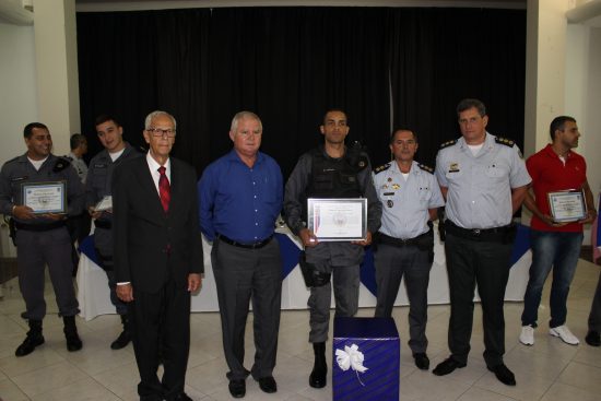 Promotor aposentado Marco Antonio, vereador Denizart, soldado Wilton Ribeiro da Força Tática,destaque do 3º trimestre, Tenente Coronel Pessanha e Comandante do CPOM Coronel Ramalho.