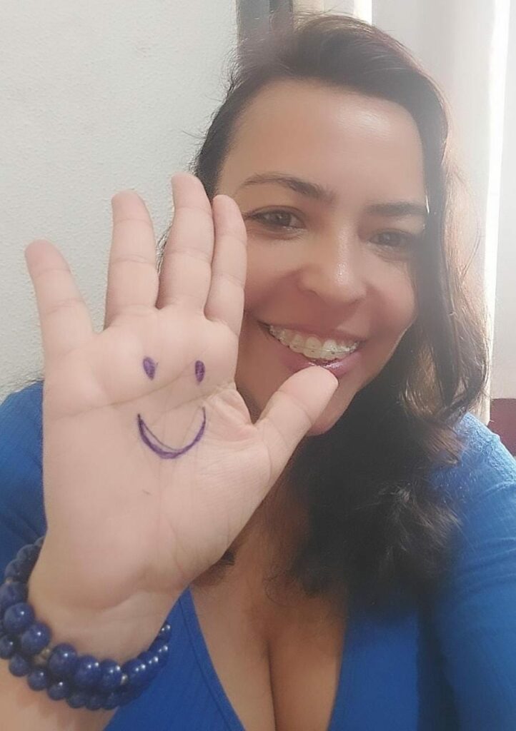 Virgínia Silva, coordenadora do grupo, mostra o símbolo doa Dia Mundial da Adoção. Foto: Arquivo Pessoal.