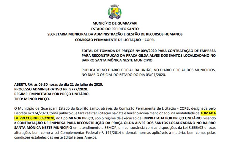O edital para a execução da obra foi lançado no dia 21 de julho de 2020 pela Prefeitura de Guarapari, com o valor de referência estipulado em R$532.714,13. No entanto, por volta de novembro do mesmo ano, as obras foram paralisadas e não retomadas.