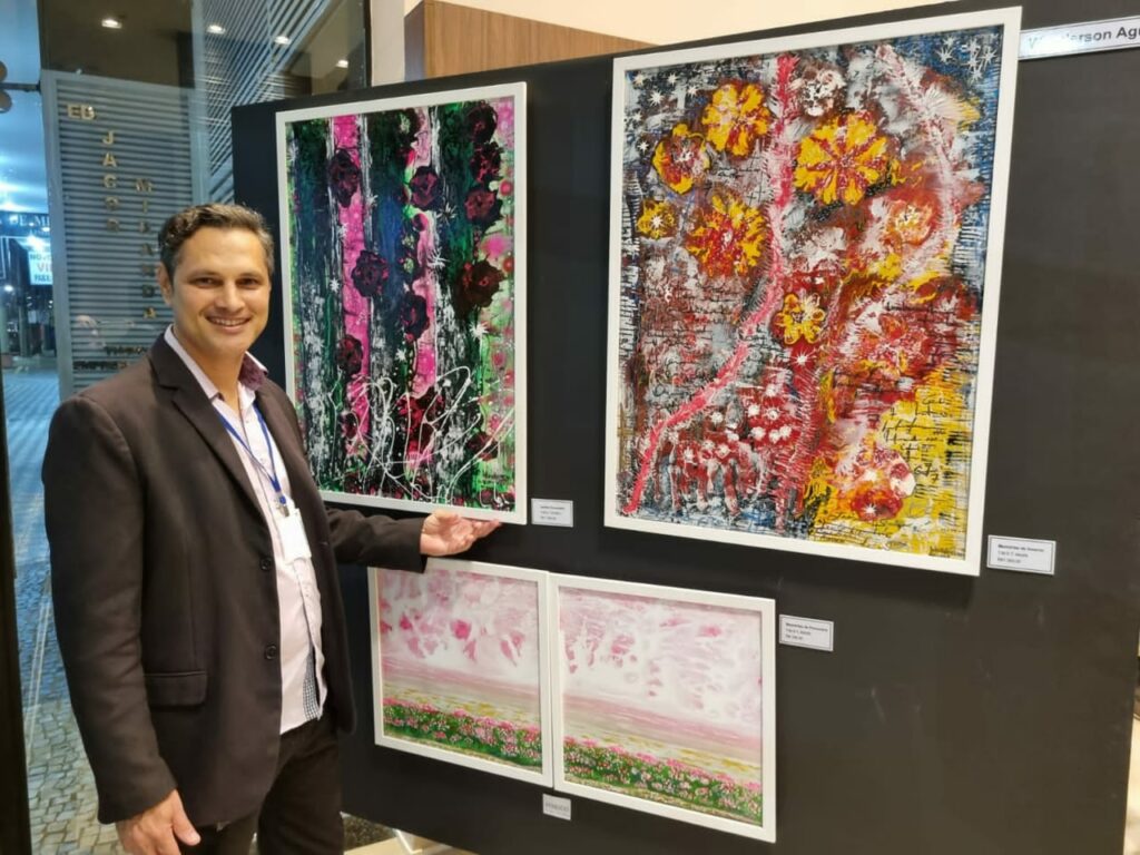 Em meio a exposição “Flores”, realizada no Espaço Cultural Tzion, em Guarapari, até o dia 10 de agosto, um artista chama a atenção: o capixaba Wanderson Aguiar, de 47 anos, que além de criar pinturas também trabalha há 23 anos como vigilante em um banco da cidade.