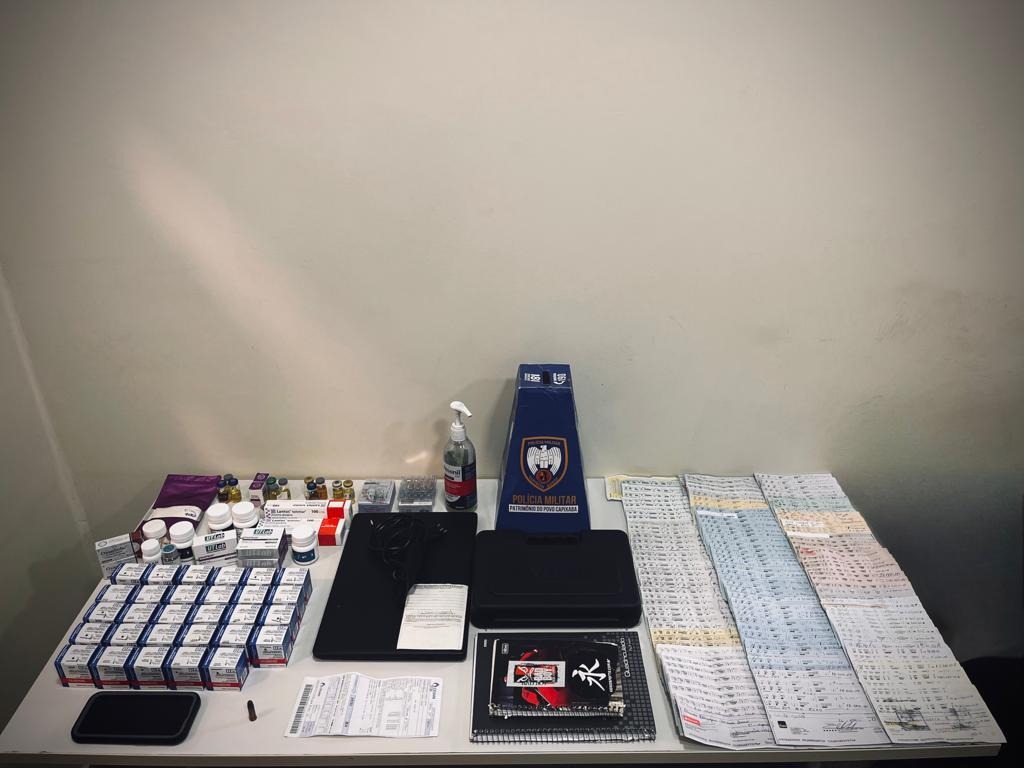 Em continuidade à ação, no bairro Ipiranga, um investigado de 28 anos foi preso. Na residência dele, foram apreendidas diversas substâncias anabolizantes e uma munição calibre .38, além de 137 folhas de cheque, sendo dois em branco, totalizando R$ 986.359,10 reais, e também uma nota promissória no valor de R$ 3.300,00.