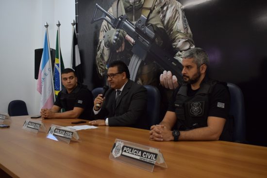 Os delegados Diego Aleluia e Breno Andrade ao lado do delegado-geral José Darcy Arruda durante coletiva sobre a operação. Fotos: Divulgação/PCES