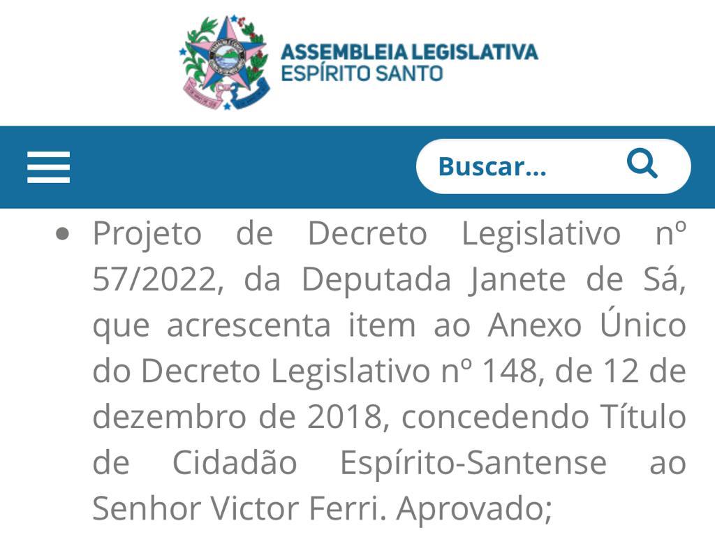 Também este ano, Victor foi contemplado com título de cidadão Espírito-Santense e recebeu a homenagem na Assembleia Legislativa.