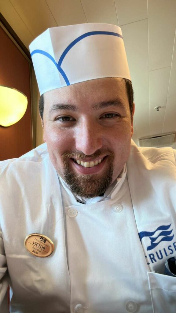Victor já tem experiência com trabalho em navios desde 2011, quando teve o primeiro contrato. “Eu tinha 19 anos e era segundo cozinheiro. Hoje tenho 32 anos e sou sous chef, responsável por gerenciar a cozinha do navio durante o cruzeiro”.