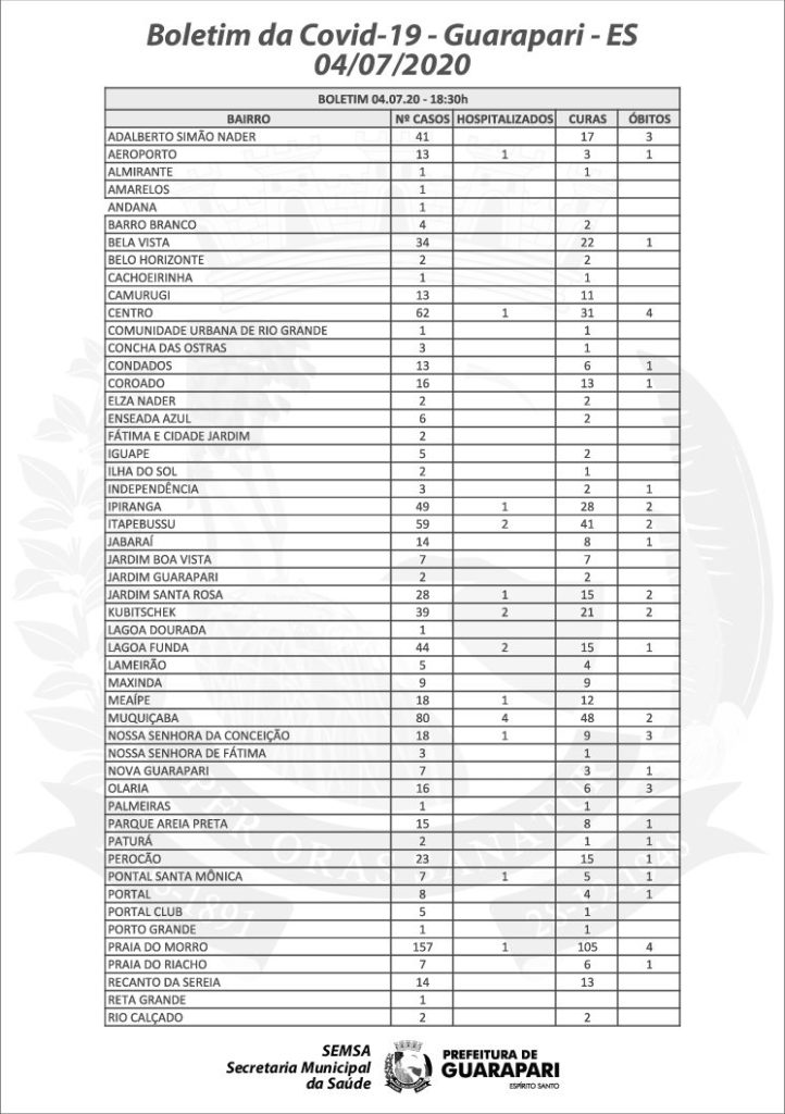 O boletim epidemiológico divulgado na noite deste sábado (04), pela Prefeitura de Guarapari, registra mais uma morte pelo novo Coronavírus (Covid-19) no município. Já são 47 vítimas da doença.