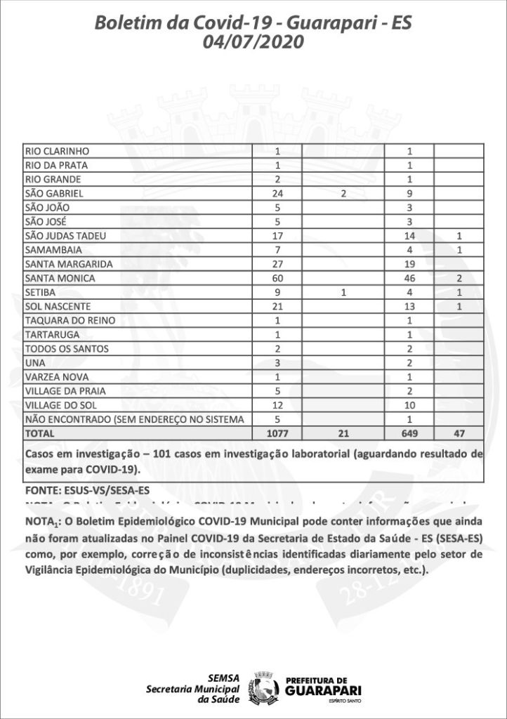 Ainda de acordo com as informações do boletim, o número de infectados da Covid-19 em Guarapari chegou a 1077. Os curados são 649, 101 seguem aguardando resultado de exames e 21 continuam hospitalizadas.