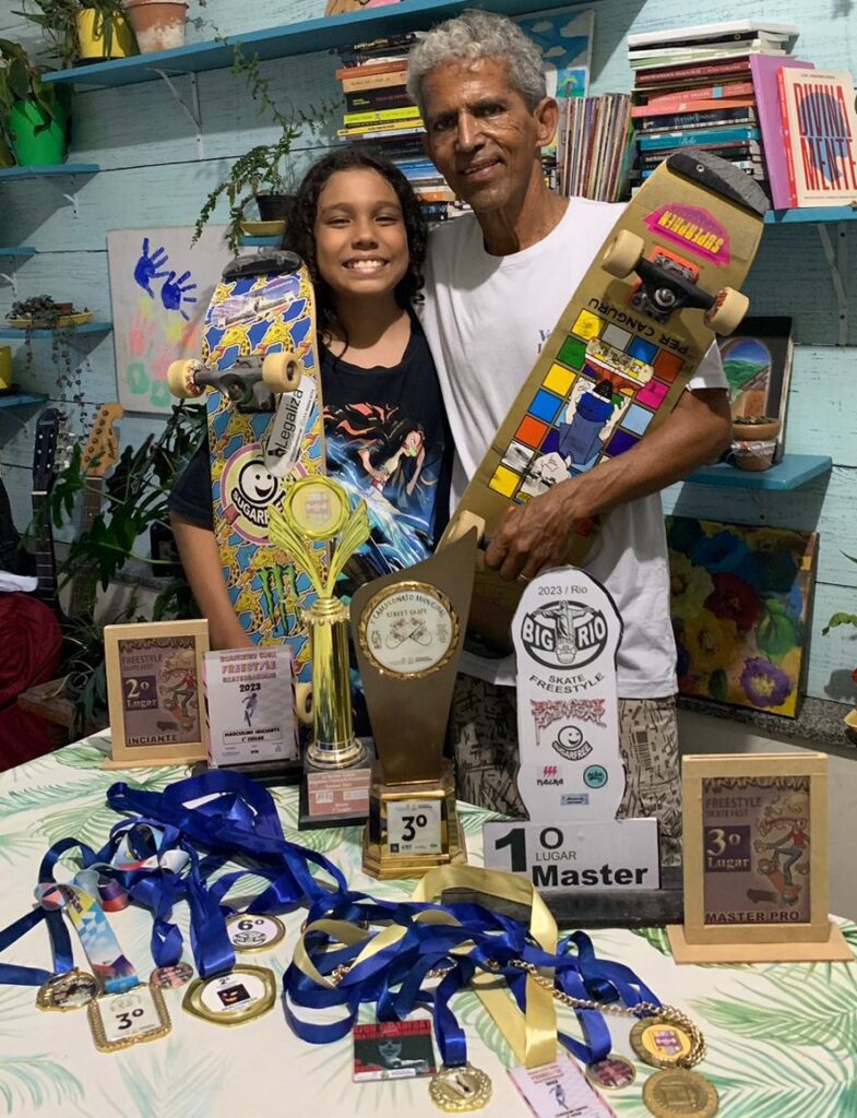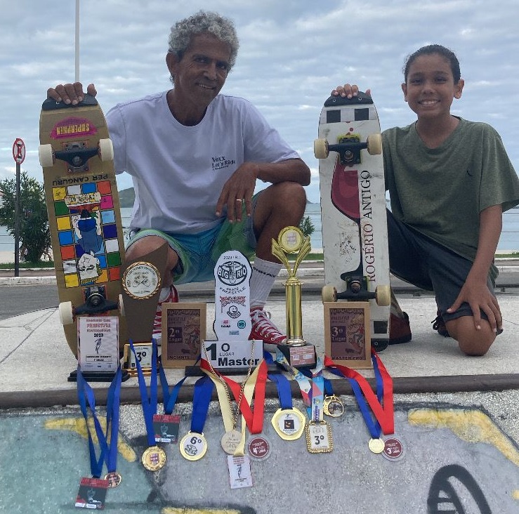 Mauro Corrêa, 63 anos, pratica a modalidade skate freestyle desde 1973, e o filho Daniel Corrêa, 13 anos, desde 2020. “Meu primeiro campeonato foi em 1980 e ganhei em 1º lugar. Voltei a participar de campeonatos em 2021 por causa do Daniel e venci duas etapas do Big Rio Freestyle! Meu filho é bicampeão nacional de freestyle pela CBSK (2021 e 2023), vencendo outros campeonatos no estilo street também”.